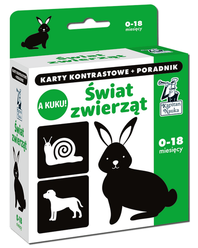 Świat zwierząt. A kuku! to zestaw pomocny od pierwszych dni życia maluszka. Pakiet zawiera karty obrazkowe w dwóch wariantach: czarno-białe i biało-czarne oraz przygotowany przez pedagoga, poradnik dla rodziców. Znajdziecie w nim porady o rozwoju niemowlaka i pomysły na twórcze zabawy z kartami.