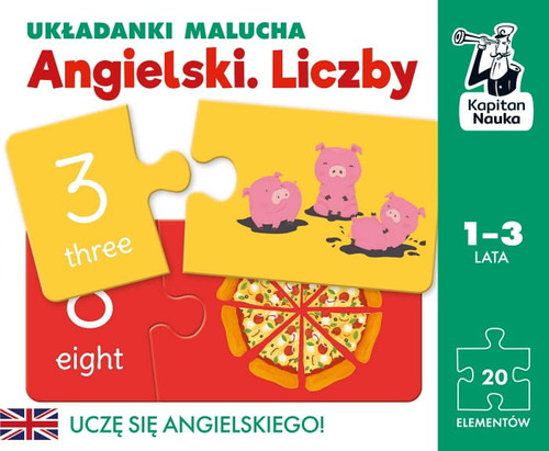 Układanki malucha. Angielski. Liczby to pakiet puzzli, dzięki którym maluchy uczą się liczyć w języku angielskim do 10. Każdy z dwuelementowych zestawów składa się z ilustracji zachęcającej dzieci do liczenia oraz liczby z podpisem w języku angielskim. Dziecko dopasowuje kolorowe rysunki obiektów do ich liczby. Dzięki nagraniom do pobrania (ze strony internetowej) osłuchuje się również z poprawną wymową, a także oswaja z zapisem angielskich liczb.