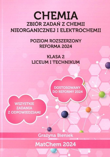 Zbiór 420 autorskich zadań z zakresu chemii nieorganicznej i elektrochemii adresowany jest do uczniów klasy 2 liceum lub technikum przygotowujących się do egzaminu maturalnego z chemii na poziomie rozszerzonym zgodnie z wymogami szczegółowymi podstawy programowej realizowanej po szkole podstawowej (Reforma 2019), planujących podjąć studia na kierunkach medycznych, przyrodniczych lub technicznych.
