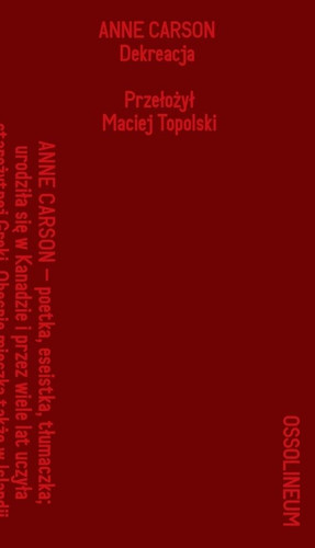W Dekreacji Anne Carson podejmuje próbę przekroczenia własnego ja, by oddać głos temu, co niewyrażalne i radykalnie odmienne. Przy pomocy naświetlających się wzajemnie utworów, w kolażu literackich form i stylów od wierszy, przez krytyczno-filozoficzne eseje i dialogi, po operę poetycką kieruje wzrok ku postaciom, które, mówiąc słowami Simone Weil, uczestniczyły w kreacji świata przez dekreację samych siebie. Pisze m. in. o Samuelu Becketcie, Marguerite Porete, Safonie czy filmach Michelangelo Antonioniego.