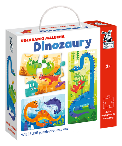 Układanki malucha. Dinozaury (2+) to trzy duuuże układanki w pionie i w poziomie, z którymi maluchy rozpoczną swoją przygodę z puzzlami. Dzieci stopniowo uczą się układać coraz trudniejsze obrazki złożone z 3, 4 i 6 elementów, w orientacji pionowej i poziomej, rozwijając przy tym wyobraźnię przestrzenną oraz sprawność manualną. Barwne puzzle zachęcają również do opowiadania o tym, jak wyglądały dinozaury, co jadły, w co się bawiły i co potrafiły robić.