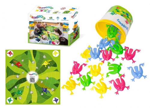 GRA ŻABKI to wspaniała gra dla całej rodziny. W jednej z gier wystarczy przycisnąć żabkę, tak aby wskoczyła do wiaderka. Kto trafi największą ilością żabek do wiaderka, ten wygrywa. Zestaw składa się z 16 żabek w 4 kolorach, plastikowego pudełka z wieczkiem oraz dodatkowej maty, która umożliwia utrudnienie całej rozgrywki. Zabawka rozwija zdolności manualne, precyzję i ćwiczy refleks. Zabawka została zaprojektowana w Szwecji, w firmie która za priorytet stawia bezpieczeństwo swoich małych klientów.
