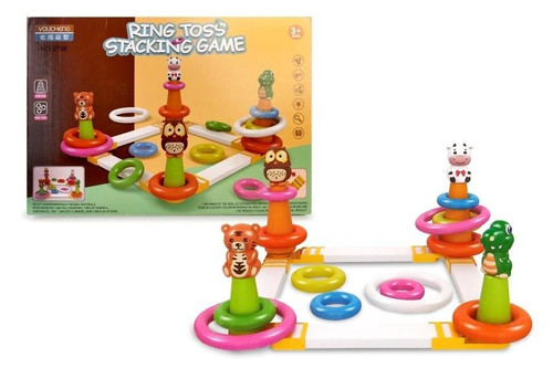 W zestawie: 4 obręcze do rzucania, elementy podstawy, paliki, 2 zestawy obręczy do piętrzenia, figurki zwierzątek montowane na paliki, funkcje: gra polega na rzucaniu obręczy tak, by trafić na wybrany palik, wym. po rozłożeniu 43 x 43 x 24 cm, wym. opak. 42 x 29 x 8 cm, 3+