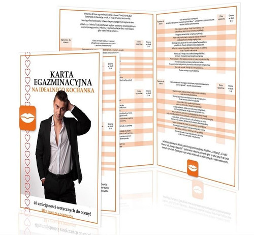 Karta egzaminacyjna idealnego kochanka to erotyczna przygoda, w której partnerka wciela się w rolę egzaminatora, a partner w rolę kochanka. Kochanka pełnego pasji, który staje przed swoją egzaminatorką, wyposażoną w listę umiejętności wymaganych przez oficjalny program edukacji erotycznej. To nauczycielka decyduje, w jakiej kolejności będą wykonywane zadania egzaminacyjne i wystawia swojemu kochankowi odpowiednią ocenę. Jeżeli ocena będzie niska, partner może próbować starać się o poprawienie swojego wyniku - do czego zachęcamy. Polecamy, aby kochanek ubrał się odpowiednio na każdy egzamin, by przygoda była bardziej smakowita!
