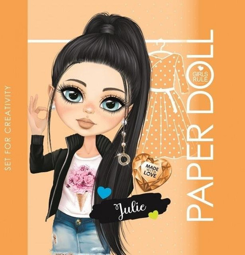 Papierowa lalka do zabawy - Julie. W środku znajdziesz wiele różnych strojów, w które możesz ją przebrać. Pokoloruj ją, a następnie wytnij z książeczki, potem ubierz - zaginając specjalnie zaznaczone krawędzie. Stroje mają wyraźne oznaczenia pokazujące, gdzie wyciąć, aby ubrania pasowały na lalkę. Baw się nimi opowiadając najróżniejsze historie. Potem możesz przebrać lalkę i zacząć zabawę od nowa. Wyprodukowano na Ukrainie.