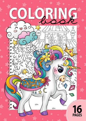 Kolorowanka dla dzieci z obrazkami jednorożców. W środku 16 obrazków do pokolorowania lub rozwiązania zagadek. Wyprodukowana na Ukrainie.