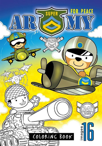 Kolorowanka dla dzieci. Na każdym z 16 obrazków znajduje się obrazek związany wojskiem, który tylko czeka żeby nabrać kolorów. Świetna zabawa dla każdego małego żołnierza! Wyprodukowana na Ukrainie.