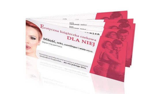 Erotyczna książeczka czekowa dla niej to prezent, który urozmaici życie erotyczne każdej pary. W środku znajduje się mnóstwo przyjemności przeznaczonych dla kobiety. Mężczyzna wciela się w rolę "wykonawcy" posiadającego dużo erotycznej energii :), którą będzie wykorzystywał, by zrealizować czeki wybrane przez partnerkę.
