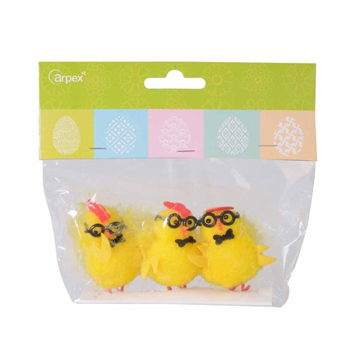 Urocze eleganckie kurczaczki w okularach i muszkach. Idealne jako ozdoba do koszyczka lub na wielkanocny stół. Pakowane po 3 sztuki. Wysokość figurki to 5 cm.