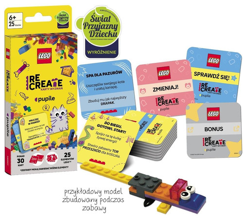 "Uwielbiasz świat LEGO(R) i nie boisz się wyzwań? Ten zestaw jest właśnie dla ciebie! Losuj karty, dobieraj klocki i twórz niepowtarzalne modele związane ze szkołą. Daj się ponieść swojej kreatywności! Plecak na nowy rok szkolny albo piórnik, klasowy zwierzak, a może nauczyciel kieszonkowy? To tylko niektóre z konstrukcyjnych zadań, jakie cię czekają w tej rozgrywce. Uwaga! Właśnie wkraczasz do świata nieskończonych możliwości budowania i przebudowywania! W zestawie znajdziesz 4 typy kart: karty TWÓRZ! inspirują do budowania, karty SPRAWDŹ SIĘ! wprowadzają kolejne konstrukcyjne wyzwania, karty ZMIENIAJ! dodają kontekst i zachęcają do przebudowywania, a karta BONUS nada zupełnie nowy wymiar zabawie! Karty Wyzwań świetnie się sprawdzą w podróży. Można się nimi bawić samemu lub z przyjaciółmi. Zestaw zawiera: 32 karty 25 klocków LEGO(R) W serii LEGO(R) Recreate. Karty Wyzwań znajdziemy także inne tytuły: Zwierzęta, Kosmos, Zamek, Przygody ninja, Przygoda w mieście, Ocean, Wynalazki, Pupile, Urodziny, Natura."