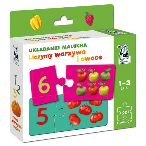 „Liczymy warzywa i owoce. Układanki malucha” (1–3 lata) zostały przygotowane z myślą o najmłodszych dzieciach, które dopiero zaczynają przygodę z puzzlami. Dzięki dwuelementowym układankom maluchy zdobywają umiejętność przeliczania smakowitych warzyw i owoców oraz porównywania, których warzyw lub owoców jest więcej lub mniej. Podczas zabawy trenują również spostrzegawczość, dopasowując ilustracje przedstawiające smakołyki z odpowiednią liczbą, a także ćwiczą koordynację oko-ręka, niezbędną w nauce pisania, rysowania i czytania.