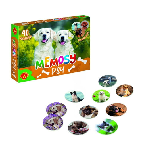 Memosy Psy to gra w której wygrywa ten, kto najlepiej zapamięta położenie par tych samych obrazków. Tabliczki rozkładamy na stole rewersem do góry, a potem odkrywamy na chwilę jedna po drugiej i próbujemy z pamięci wskazać miejsce pasującego obrazka. Gra jest skierowana jednocześnie do dzieci i dorosłych. To świetny trening pamięci i spostrzegawczości. Zapewnia dużo dobrej zabawy i emocji w otoczeniu przepięknych zdjęć psów.