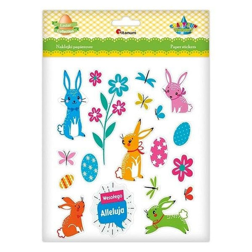 Naklejki papierowe: zajączki, pisanki, kwiaty, motyle, ważki, napis "Wesołego Alleluja", 19 szt.