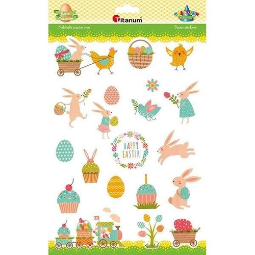 Naklejki papierowe: króliczki, pisanki, koszyczki, pociąg, napis "Happy Easter", 20 szt.