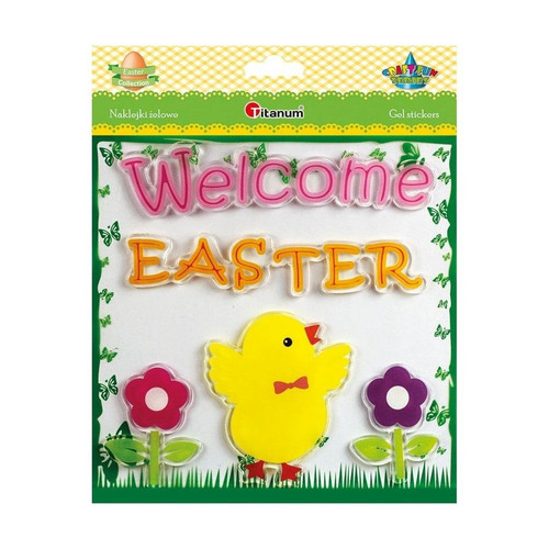 Naklejki żelowe napis Welcome Easter, kurczaczek, kwiaty 5szt.