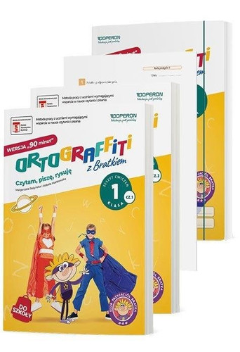 Seria Ortograffiti z Bratkiem występuje w dwóch wersjach: wersji "90 minut" i wersji "45 minut". Wersja "90 minut" (dotychczasowa) jest przeznaczona dla tych nauczycieli, którzy prowadzą 2 godziny zajęć korekcyjno-kompensacyjnych lub dydaktyczno-wyrównawczych w tygodniu w danej grupie, zaś wersja "45 minut" dla tych, którzy prowadzą 1 godzinę takich zajęć w tygodniu. Ortograffiti z Bratkiem. Wersja 90 minut. Klasa 1. Zestaw W zestawie: 2 zeszyty ćwiczeń na jeden rok szkolny: Ortograffiti z Bratkiem. Wersja 90 minut. Klasa 1. Część 1. oraz Ortograffiti z Bratkiem. Wersja 90 minut. Klasa 1. Część 2. Karty pracy - 32 karty pracy, w tym karty postępów i karty pracy domowej. W ramach podsumowania prowadzący wypełnia z uczniami kartę postępów na koniec każdego bloku. Karty pracy domowej pozwalają dzieciom utrwalić wiadomości z danych zajęć. Dodatkowo w zestawie są karty z pomocami dydaktycznymi do samodzielnego wykonania: zjadacz liter, okienko do czytania. A także: dyplom, gra memo do wycięcia, planszówka, inne. Teczka do przechowywania materiałów i kart pracy. Polecamy zakup zestawu, gdyż zawiera komplet materiałów do pracy z uczniem i gwarantuje kompleksowe zastosowanie Metody Ortograffiti z Bratkiem. Uzupełnieniem serii Ortograffiti z Bratkiem do szkoły jest wersja do domu zatytułowana "205 zabaw i ćwiczeń wspierających naukę czytania i pisania". Poleć ją rodzicom, a będziecie wspólnie cieszyć się jeszcze lepszymi efektami.
