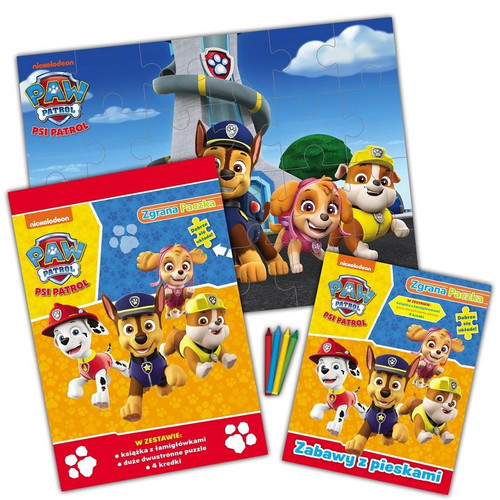 Ruszaj na wspaniałą przygodę z Psim Patrolem. Zestaw zawiera książkę z mnóstwem zadań i łamigłówek, kolorowe kredki oraz dwustronne puzzle. Jeden z obrazków układanki można pokolorować według własnego pomysłu.