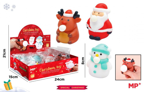 Wymiary: 6x7,3cm. Postacie o tematyce bożonarodzeniowej, o żywym, realistycznym wyglądzie. Gniotki można ustawić w pozycji pionowej. Po naciśnięciu brzuszka z ust wydobywają się bąbelki, a następnie gniotek powoli wraca do swojego pierwotnego kształtu. Idealny do łagodzenia stresu. Wykonany z przyjaznego dla środowiska materiału zgodnego z normami Unii Europejskiej. Nadruk jest trwały i nie blaknie łatwo. Dostępny w 3 różnych wzorach: renifer, Mikołaj, bałwanek.