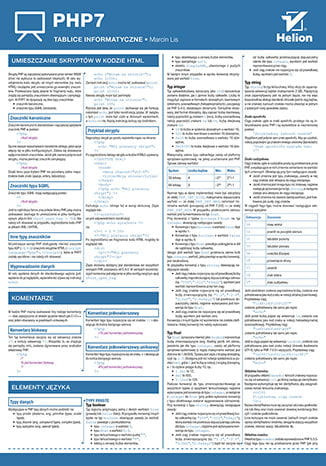 Jeśli nie chce Ci się za każdym razem szukać w książkach potrzebnej instrukcji, zmiennej czy funkcji, zainteresuj się Tablicami informatycznymi. PHP7. Przejrzysty układ z podziałem tematycznym ułatwia szybkie znalezienie dowolnego elementu języka, a krótkie komentarze pomagają we właściwym użyciu tego elementu. Doceń prostotę i funkcjonalność tego rozwiązania!