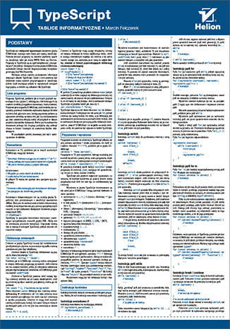 Tablice informatyczne. TypeScript to niezwykle skondensowane źródło wiedzy, które umożliwia szybkie przypomnienie sobie składni i konstrukcji języka oraz sposobów ich zastosowania. Przejrzysty układ tablic sprawi, że z łatwością odszukasz informacje o typach oferowanych przez TypeScript, a także zaznajomisz się z metodami korzystania z bibliotek i zarządzania projektem opracowanym w TS.