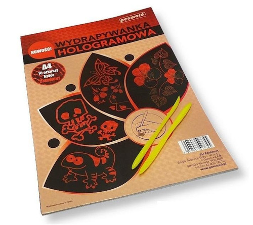 W zestawie 10 arkuszy z czarną farbą oraz dodatkowo 2 rysiki z dwoma różnymi końcówkami, służące do wydrapywania obrazków.