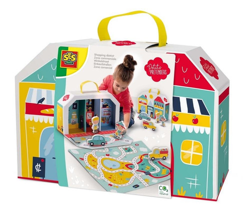 Ta piękna torba uliczna do zabawy na zakupy z linii Petits firmy SES, zawiera matę do zabawy i cztery drewniane figurki do zabawy, zapewnia wiele godzin zabawy! Idź do miasta po zakupy lub bukiet kwiatów. Wybierasz się na spacer czy autem? Tymczasem sklepikarz jest zajęty uzupełnianiem zapasów. Och, korek, czy wróci na czas, żeby otworzyć sklep? Tak, czeka na ciebie, śmiejąc się! Jaka będzie twoja historia? Dzięki poręcznemu uchwytowi i magnetycznemu zamknięciu możesz zabrać ze sobą futerał do zabawy, gdziekolwiek jesteś. Ulice na pudełku i macie do zabawy ładnie do siebie pasują i można je rozbudować za pomocą wielu zestawów.