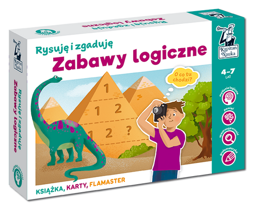 Zestaw Rysuję i zgaduję. Zabawy logiczne (4–7 lat) zawiera różnorodne zadania ćwiczące myślenie logiczne, m.in. uzupełnianie sekwencji, klasyfikacja obiektów ze względu na kolory, kształty i wielkość, porządkowanie przedmiotów w kolejności za pomocą ciągów liczbowych i czasowych, rysowanie możliwych tras przejścia w labiryntach, uzupełnianie tabeli według wzoru czy gra w kółko i krzyżyk.